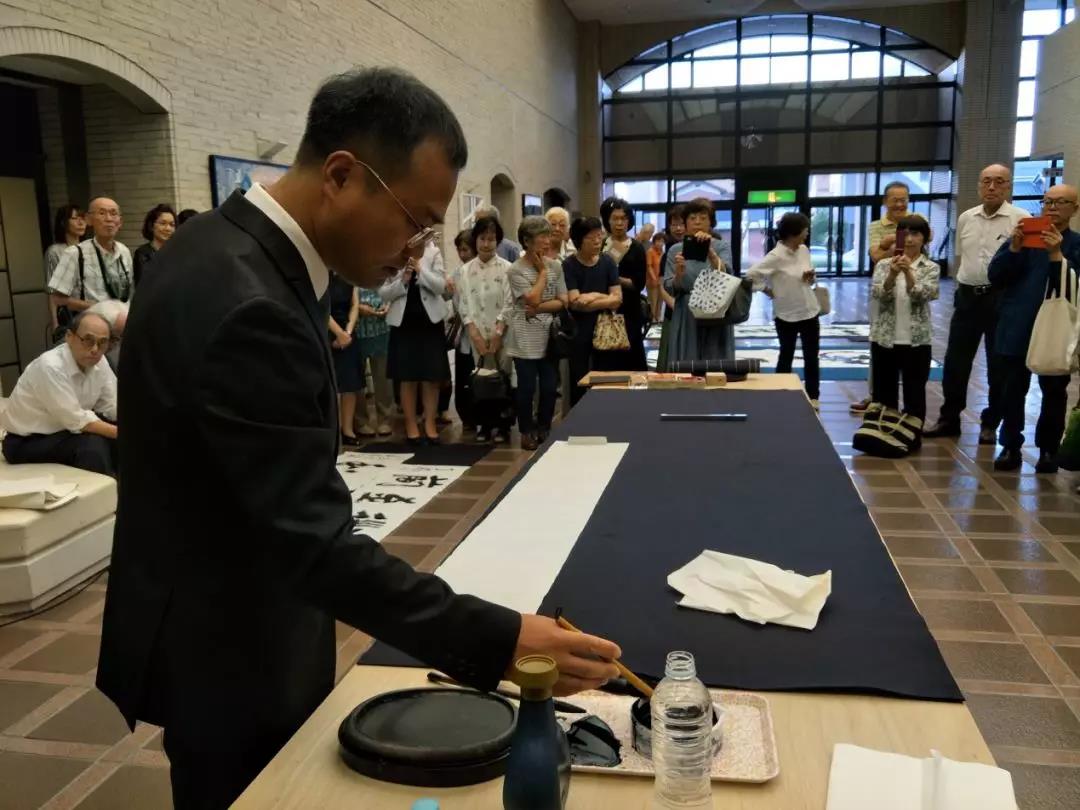 王波老师在致辞中表示,非常高兴作为台州市政府委派的民间文化友好交流团,来到美丽的敦贺市进行访问,感谢渕上隆信市长以及在座各位朋友的热情邀请和盛情款待!王老师详细回顾了台州、敦贺两座城市的历史渊源和缔结友好城市以来的交流历史,表达了台州市长张晓强对此次“敦贺节”活动的良好祝愿和邀请隆信市长回访的意愿,简要介绍了台州市书法家协会的基本情况,表示此次的文化交流活动可以成为双方交流进一步密切、合作进一步深化、友谊进一步加深的新起点,两市的友好关系会因为越来越频繁的“文化碰撞”更上一层楼!