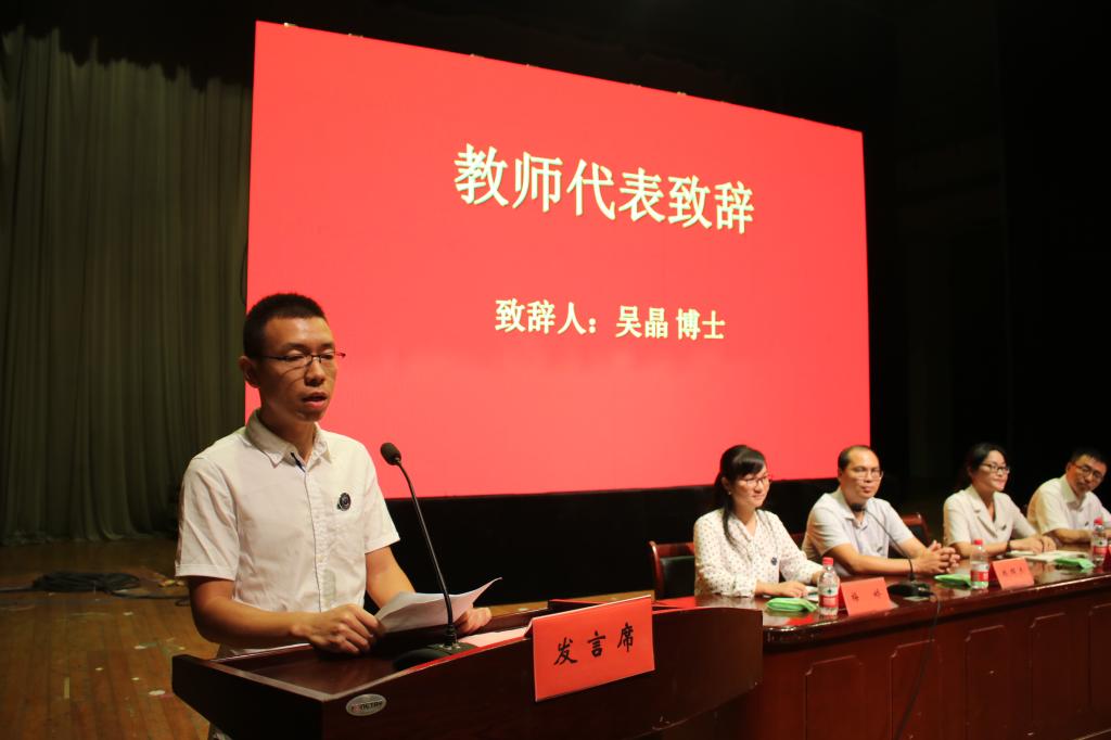 教师代表吴晶博士发言,向新生们阐述了在大学里如何逐步形成自己的人生观、价值观,要学会规划大学时光,利用自己的兴趣和特长锻炼自身能力,并希望新生们学会做一个既有专业水平,又有人格魅力的人。