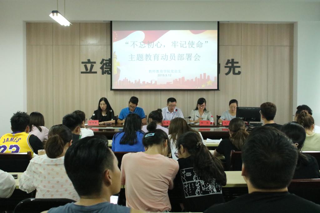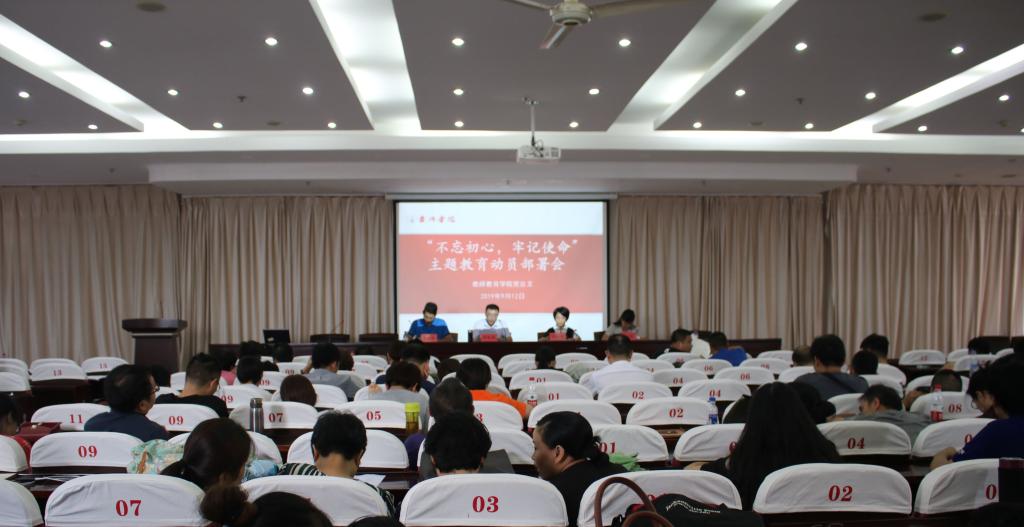 2019年9月12日下午3:00,教师教育学院党总支在临海校区学术报告厅召开“不忘初心,牢记使命”主题教育动员部署会,共有110名教职工参加,会议由赵校民书记主持。