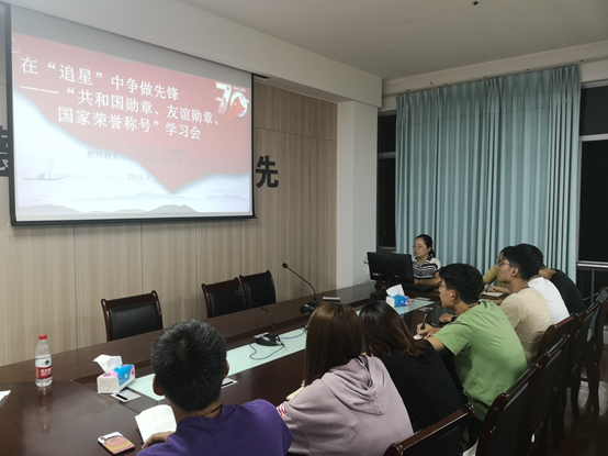 今年9月,国家主席习近平签署主席令,在庆祝中华人民共和国成立70周年之际,授予42人国家勋章和国家荣誉称号。这些称号获得者来自各行各业,他们的事迹和经历感人至深,共和国不会忘记,人民不会忘记他们为中华民族伟大复兴梦作出的杰出贡献,胸怀爱国心,笃行报国志,在座的学生党员备受感动,大家表示要秉承“中国之星”的力量,志存高远,求真务实,奉献拼搏,勇于创新,在实际的学习和生活中争做先锋,充分发挥党员的先锋模范作用,为学校“一三五”发展努力奋斗,为共和国明天添砖加瓦。